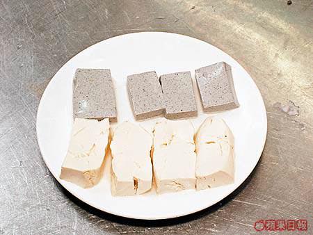 白豆腐是大家相當熟悉的布包豆腐,而灰灰的那塊是日本的胡麻豆腐,就是黑芝麻豆腐。這種日本豆腐比較嫩滑,而且帶有黑芝麻香味,日式超市可以找到。