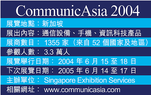 自1979年開始舉辦的CommunicAsia2004,去年因為SARS而停止舉辦,今年則恢復舉行,共吸引了來自50個國家、388家廠商、共計逾1300家展商參與,其中以亞洲廠商為主,包括了日本、韓國、中國、新加坡等。