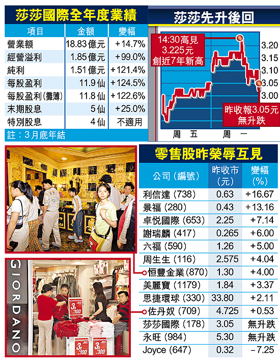 【本報訊】零售業在自由行帶動下,不但收復「沙士」時的失地,生意更直線上升,近期公布業績的零售股均表現理想。莎莎國際(178)昨日公布截至04年3月底止全年度純利達1.51億元,大幅上升1.21倍,股價更一度創7年新高。證券商預料,隨着七一後內地更多省份開放個人來港旅遊,零售股可繼續受追捧。