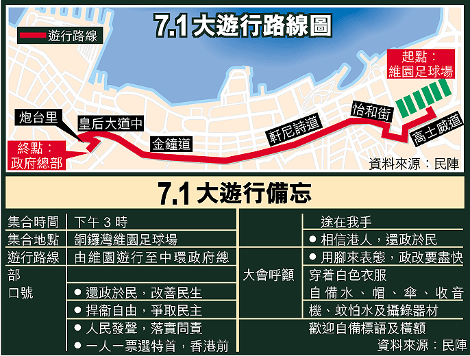 民陣已與警方就大遊行的安排達成共識,民陣副召集人譚駿賢昨於記者會上表示,民陣至今只能就遊行的器材投買保險,仍未有公司肯承保場地保險,而大遊行將以維園足球場作集合點,當六個足球場都企滿人時,較後抵達的市民將被安排至維園草地及手球場等候出發。