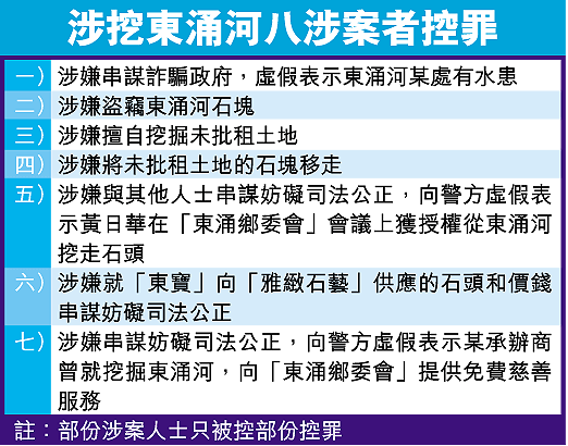 當中羅錦輝與黃日華同被控四項控罪,其中一項控罪指他們涉嫌一起串謀詐騙政府,虛假地表示東涌河某段有水患,而另一項控罪指他們涉嫌盜竊東涌河石塊。二人另被控兩項罪名,包括一項擅自挖掘未批租土地及一項將未批租土地石頭移走。