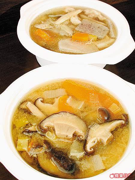 日式味噌湯湯底由海帶、木耳等煲成,因為湯料豐富無味精,喝後絲毫不覺口乾。