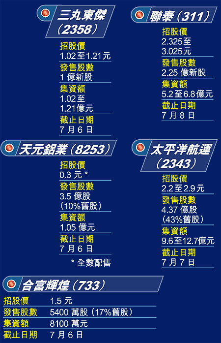 另外三家公司,包括集資額較大的成衣生產商聯泰(311)及散乾貨船公司太平洋航運(2343),分別最多集資6.8億元及12.7億元。