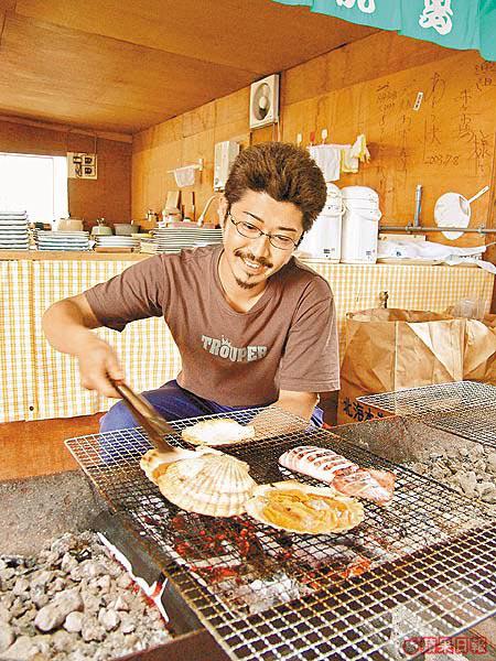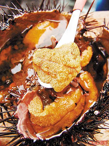 就在最失望的時候,竟讓我碰上了一間像大牌檔似的海鮮市場,門外的大水池內,嘩!你看你看,是一隻隻活生生的紫海膽呀!我興奮極了,立即買一個就地正法!漁民用上熟練方法,不消一秒已將海膽一分為二。哈哈!一粒粒肥肥大大的黃金色海膽肉正在向我招手呢,不要客氣了,還未坐下我已急不及待用手將海膽放入口。噢!一陣海水的鹹味伴上嫩滑清香鮮甜的海膽肉,就像風似的轉瞬滑進喉嚨,那陣鮮味實在無法抵擋。麻煩再來3個海膽吧!我欲罷不能,跌進海膽的懷抱去了……