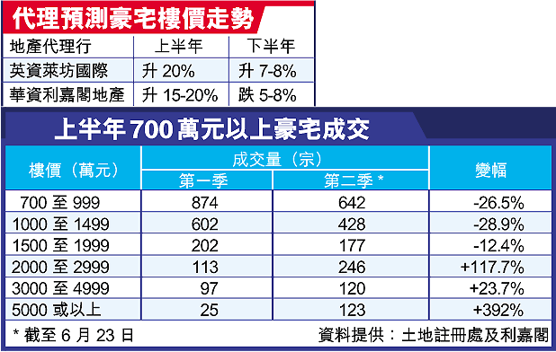 【本報訊】豪宅市場供應有限,價格自去年下半年大幅反彈,成為最受投資者追捧的物業之一,今年上半年仍續升20%。至於下半年走勢則意見分歧,國際物業顧問認為豪宅仍跑贏中小型住宅,再升值7至8%;代理本港物業為主的利嘉閣地產則估計,第三季會下調5至8%。