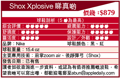Xplosive能成為「戰場」中的一員,憑的就是:輕巧、保護、耐用且好着,我認為其表現更是Shox系列中的「一哥」;若你budget有限,想買功能齊又襟着的籃球鞋,ShoxXplosive是上佳的選擇!