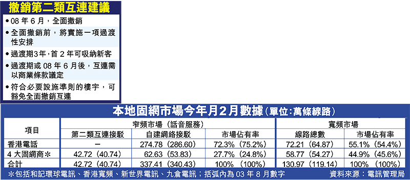 【本報訊】備受業界關注的第二類互連政策檢討正式完結。港府昨日正式公布,實施逾9年的互連政策,將於08年6月30日全面撤銷有關規管措施。其間會提供「2+1」的3年過渡期,一方面鼓勵利用互連的營運商投資,同時亦保障消費者利益。