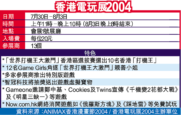 本港視像遊戲及相關產品在九八至○二年間的進口總值,由二十三億元增至八十七億元,反映數碼娛樂業迅速發展,因此今年漫畫節將增辦首屆香港電玩展,集合全港最具實力的電玩及網絡遊戲發展商,展示最新產品。