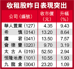 繼仲量聯行及世邦魏理仕唱好商舖市道,戴德梁行昨日表示,寫字樓市道持續暢旺,預期04年全年中環及金鐘寫字樓租金將實質增長30%。滙豐證券地產研究部主管張一鳴表示,自由行概念令零售股率先受追捧,昨日由收租股接棒。再者,政府提議在銅鑼灣心臟地帶發展行人專用區及地下街,有利增加人流,對商舖業主有利,故在該處持有物業的收租股最受惠。