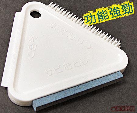 由日本貝印出品的三角嘜清潔刷,形狀為一個等邊三角形,其獨特設計不僅拎起來夠就手,最重要是每一邊均附有特殊功能。設有磨石的一邊用來磨刀,刷子的一邊是用來清潔木製砧板,至於平滑的一邊則用來刮走洗碗盆邊的水迹和油迹,功能可謂相當多樣化。
