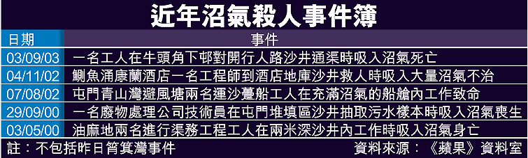 記者事後表示;「我第一時間趕到現場出事沙井,企喺沙井口拍攝消防員救人時,由沙井湧出來嘅污水泥濘惡臭,令我好難受,當時冇諗過湧出嘅惡臭係乜嘢氣體,但事後胸口就翳悶不適。」記者在現場近距離採訪近一小時後,疑亦吸入沼氣令身體不適,喝下大量清水後情況才稍為好轉。