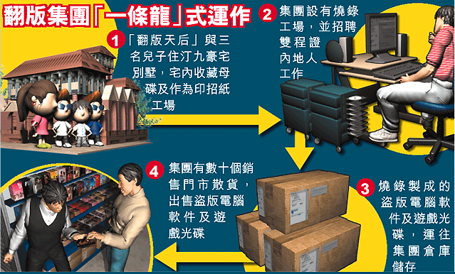 消息指,被捕翻版天后已喪夫,以家族式經營翻版集團,由生產製造盜版光碟,到儲存包裝以至門市銷售,均採一條龍式運作,零售網絡更遍布港九各區,有數十間之多,最多在灣仔及深水埗,其三名兒子是集團主要骨幹,分管製造及零售業務。
