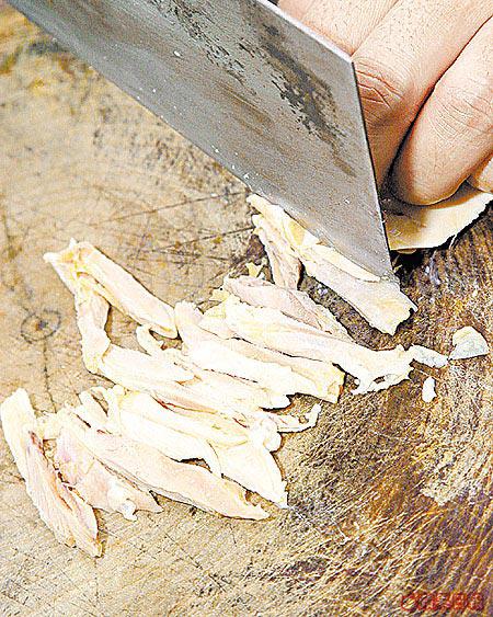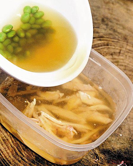 用來做「啫喱」的上湯,可以罐頭清雞湯代替。煮時上湯不要煮得太久,不然味道會變得過鹹,而且顏色也會變深。上湯一定要以慢火浸熟雞髀,也必定要去雞皮,這樣煮出的雞肉才不會「嚡」口。同時也不要以為魚膠粉放得愈多便愈好,因為放得太多反而會使雞凍變得硬身,但放得太少又會太稀而不足以凝固,所以這是頗考功夫的一環。