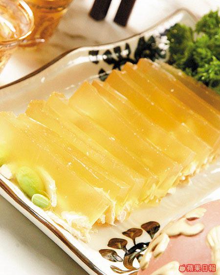 蛋黃小卷,遠看還以為只是無甚特色的雞蛋切片,但其實它是充滿鹹蛋甘香和魷魚鮮香的特色凍食,配搭新鮮,作為小吃或前菜,絕對滋味。另一道啫喱雞凍,賣相金黃,外表晶瑩剔透,十足我們平時吃的甜品啫喱。望落已可想像它的冰凍感覺,吃入口極香濃的上湯香味佔據整個味蕾,啫喱軟滑爽口,加上底層的嫩滑雞肉和甘香毛豆,口感特別。