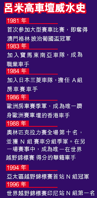 在賽車場上曾獲獎無數的呂米高,在銅鑼灣浣紗街經營車行,昨記者致電其手提電話俱飛線至留言信箱,記者往車行找他,職員表示東主只間中返回。問如何聯絡東主,職員答道:「我哋都搵佢唔到。」