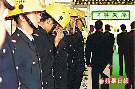 昨日約有三百人出席葬禮,警方事前將附近道路封鎖。上午八時許,一批批臂纏黑紗的消防員陸續到來致祭。特首董建華、政務司司長曾蔭權、財政司司長唐英年、律政司司長梁愛詩等致送花牌;保安局局長李少光、警務處處長李明逵、公務員事務局局長王永平,署理消防處長郭晶強及剛卸任立法會主席之范徐麗泰,親自到場致祭。