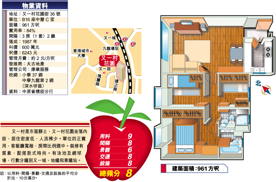 又一村花園居住密度低,有洋房及分層兩類選擇,介紹的分層,望花圃街,沿兩旁行人路上栽種綠樹,青葱有生氣。單位兩年前翻新,客廳裝上落地大窗,視野貫通無阻,觀感更佳。 客飯廳其他裝修,包括鋪砌深色木地板,沿牆建假天花燈槽,建地櫃及飾櫃。玄關及走廊也建天花燈槽,加強照明。三房度身訂做家具,廚廁換上時尚設備,例如玻璃罩抽油煙機、金屬焗爐、線條俐落的水龍頭,內外布局新潮。 單位九百餘呎,間隔不俗,客飯廳及套房寬闊好用,兩間細房六七十呎,易放基本家具。 記者:溫潤潔 攝影:司徒世華