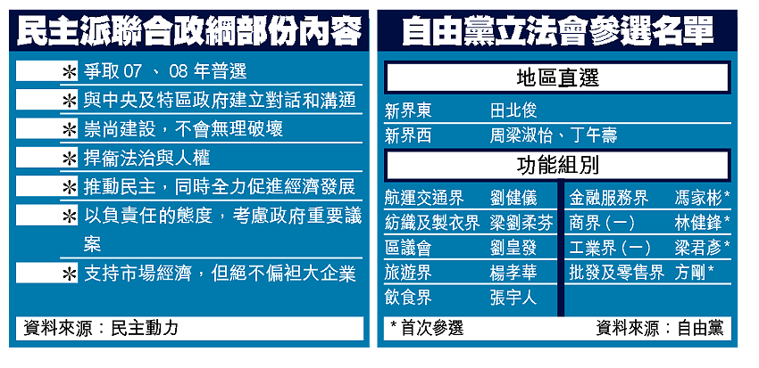 另外,泛民主派昨公布題為「爭取民主、捍衞自由、燃點希望、重建香港」的聯合競選政綱,當中特別提及願意與中央及特區政府建立對話和溝通;民主派也不會無理破壞,會以負責任的態度審議政府的議案。