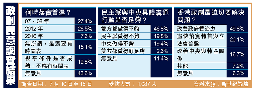 另外,議政團體新世紀論壇在七月中就普選問題訪問了約一千人,雖然中央於四月否決了○七、○八年普選,令支持盡快普選的受訪者由去年7.1後的三成七降至今年七月的兩成七,但被問及何時應落實特首和立法會雙普選時,最多受訪者堅持應於○七、○八年進行,佔兩成七人,選擇二○一二年的則有兩成六人。