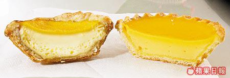 鱷晶蛋撻(左)顏色較淺,氣泡多,放多久蛋撻面都依然乾爽;普通蛋撻(右)色澤較深,蛋撻餡沒有氣泡,放了一會,便有水份積聚在面層。