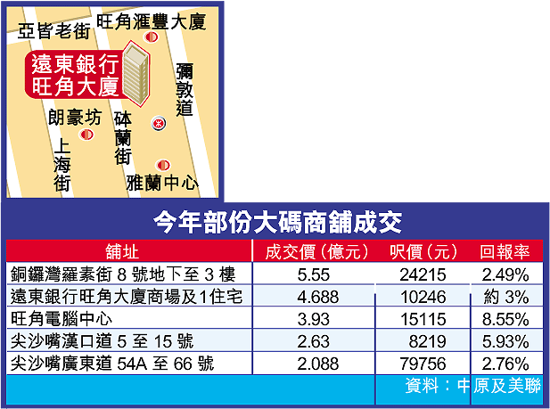 【本報訊】旺角最大型商業項目朗豪坊入伙在即,刺激同區店舖交投,遠東發展(035)趁勢以近4.7億元,售出遠東銀行旺角大廈商場部份,為年內舖市第二大成交,據悉買家為資深投資者黎永滔及有關人士。