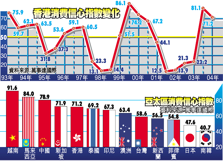 【本報訊】萬事達卡的調查顯示,香港消費者對未來6個月的前景仍然樂觀,信心指數達到71.2(滿分為100),雖低於半年前的81.1,但高於去年第二季的23.2和歷史平均數46.8,在亞太區排第5。萬事達卡消費信心指數調查每年做兩次,分別在第二季和第四季。