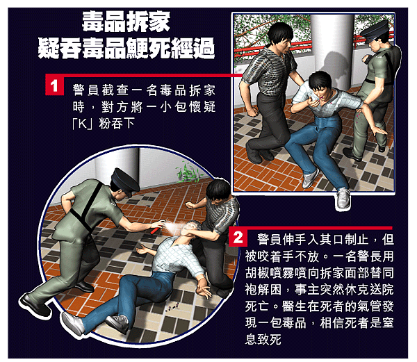【本報訊】旺角昨晨發生毒品鯁死人罕見命案。一名年輕毒品拆家在街頭被警員截查時,疑企圖將身上一小包懷疑「K」粉吞下毀滅證據,一名警員伸手入其口圖制止,但被對方咬着不放。在場警長用胡椒噴霧替同袍解困後,事主疑意外吞下毒品卡在氣管窒息死亡,法醫今日會剖屍確定真正的死因。 記者:伍浦鋒 林榮海