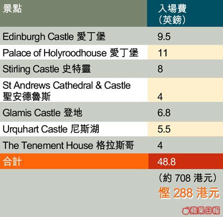 英國有600多個古迹,單是蘇格蘭便有接近140個,包括有城堡、皇宮、花園、公寓大宅及教堂等,不妨購買一張英國古迹通行證GreatBritishHeritagePass,分別有264港元的4日證、420港元的7日證、552港元的15日證,以及720港元的1個月證,在指定日數內可任遊600多個古迹,隨證更附送一本47頁的GuideBook,詳細列出逾600個古迹及其位置,方便旅客安排行程。今次就計劃了一個蘇格蘭10日之旅。