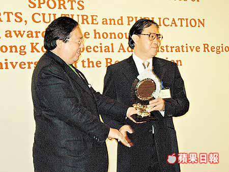 圖為何志平向霍震霆頒贈紀念章。 盧漢傑攝