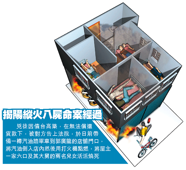 【本報訊】揭陽消息:廣東揭陽市經濟試驗區漁湖中路一電單車行較早前被人縱火燒舖,造成車行老闆一家六口及親戚兩名小童共八人慘死案件,公安在案發後四日迅速破案並將兇徒拘捕。兇徒竟是死者的好友,他因嗜賭「六合彩」而債台高築,在無法償還貨款下,被對方告上法院,疑兇因懷恨在心憤而縱火報復,造成滅門慘案。