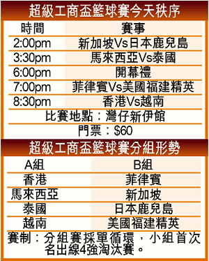 傷兵滿營的香港男子籃球隊,今晚將踏上衞冕超級工商盃國際籃球邀請賽之途,在灣仔新伊館迎戰越南,教練麥錦輝表示對首仗獲勝充滿信心,並視馬來西亞為小組首名出線最大敵人。