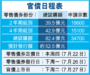 【本報訊】官債零售部份昨日截止認購,政府晚上公布,2及4年期組別共獲得82.4億元的認購額,兩組約各佔一半,以認購金額計超過五隧一橋債券的77.19億元,是次申請宗數為3.47萬宗,若要滿足每名申請人獲分配一手的目標,總發行額只需17.35億元便可達到,而是次零售部份發行額應為52.5億元,故相信最終每名申請人可獲分配最少一手5萬元的官債。