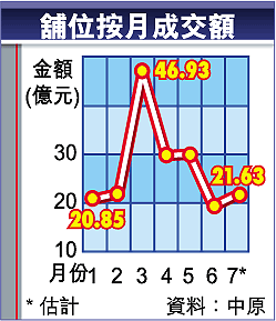 美聯物業舖位部區域營業董事盧展豪說,受自由行帶動,舖市於2至3月顯著暢旺,交投量及總值均飆升,6月開始整固,至本月價格雖然維持,但承接力轉弱,交投量較2至3月高峯期跌30至40%。