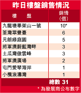 【本報訊】市場期待發展商在下半年有新一輪新盤推售攻勢下,發展商旗下貨尾樓盤如「賣剩蔗」般,銷情不濟。昨日只售出31個單位,較對上周六更差,再跌近三成。