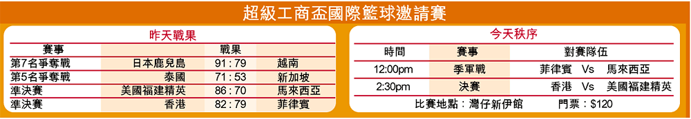 衞冕的香港男子籃球代表隊,昨晚在灣仔伊館舉行的「第十三屆超級工商盃國際籃球邀請賽」,四強戰以八十二比七十九險勝菲律賓殺入決賽,今日將與美國福建精英邀請隊爭奪冠軍寶座。(無綫電視翡翠台今日2:15pm直播)
