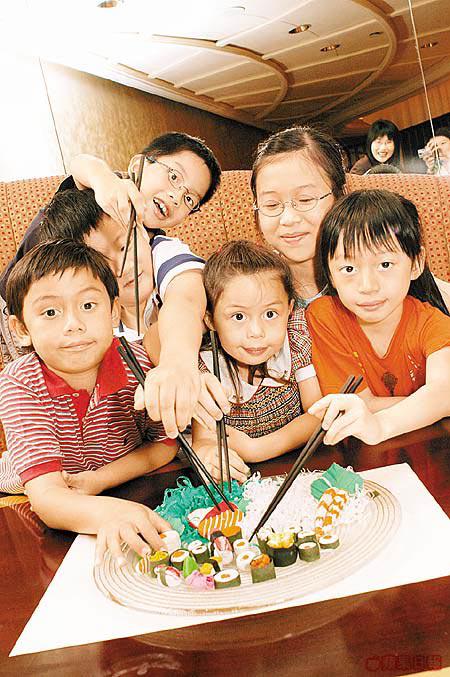 又是小朋友至愛的IQ時間:右下方有兩張相,一張是小朋友張開筷子的為食相、另一則是戴了廚師高帽的捧餐相,考眼光估吓邊盤至係食得落肚的真壽司?