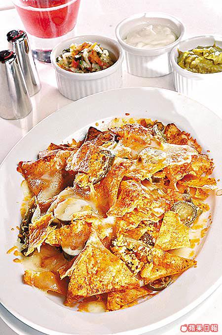 將墨西哥脆片、車打芝士及墨西哥辣椒焗香,分別配以三種不同醬料同吃,包括牛油果醬、酸忌廉及番茄番芫荽洋葱醬,份量大得可當主菜。