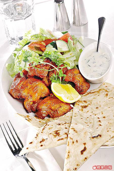 以香料醃製雞塊,然後以印度傳統方法烹調,配以青瓜乳酪同吃,雞肉份外嫩滑香口,兼有青瓜的清爽口感。加上伴碟的沙律,即使食串燒也不怕熱氣。