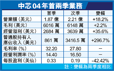 中芯期內銷售額2.21億美元,較首季升18.2%;銷售成本亦按季升25.8%,至1.59億美元;經營開支卻按季減少24.7%,至2509.1萬美元,令經營溢利3639萬美元,升35.6%。