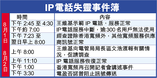 電管局發言人證實,昨日早上收到香港寬頻報告,指其IP電話傳送發生問題。該局理解有關傳送現已回復正常,當局亦會與網上行服務供應商IMS溝通及跟進事件。她續稱,市場早已有其他IP電話服務存在,當局會在年底前就IP電話的規管進行諮詢。