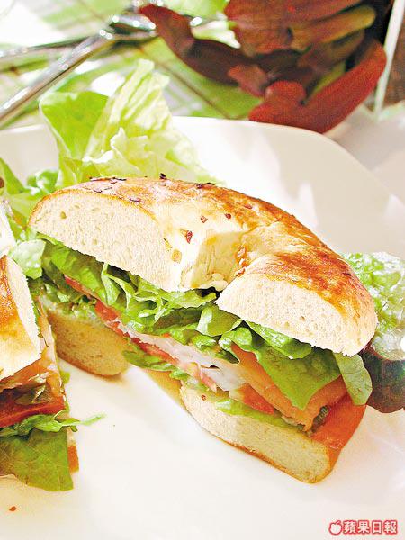 Bagel皮入口自紐約,康太說由於香港水質關係,做不出正宗Bagel皮煙韌有嚼勁的效果,只能做到麵包而已。用它配合煙三文魚、忌廉芝士、雜菜等,風味十足。