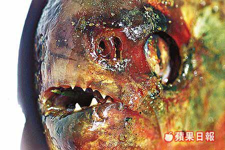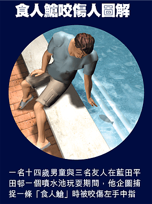 昨凌晨二時,十四歲姓陳男童與三名友人進入噴水池嬉水期間,陳童發現池內有三條魚游來游去,惟不知其中兩條為十分兇惡的食人䱽,他好奇上前捕捉時,不慎被其中一條食人䱽鋒利的牙齒咬傷左手中指,當場鮮血四濺,事後因傷口十分痛楚向看更求助召救護車送院,陳童手指的傷口需縫上三針,並要留院接受觀察。