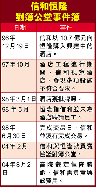 信和在96年與恒隆簽訂買賣協議,購入恒隆旗下位於荃灣油柑頭的酒店發展項目,其後信和以恒隆的酒店未達合約要求,向恒隆索回3.21億元定金,但恒隆則反駁指信和撻定,要求沒收該筆定金,並指由於物業價值急跌,故向信和追討約5億元的差額。