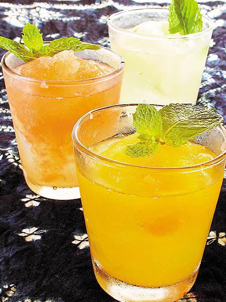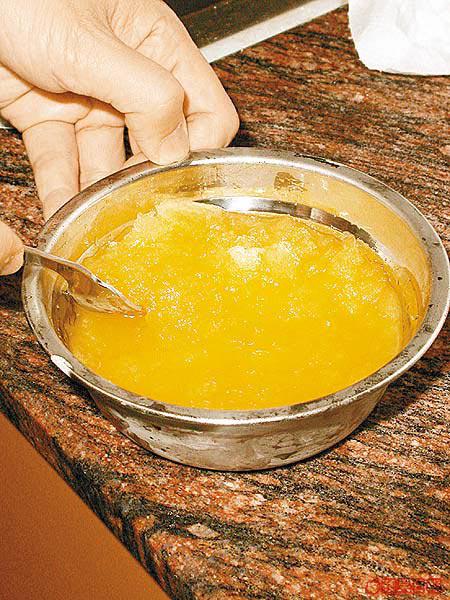 水果榨汁後,取出剩餘的果肉,加入糖水中一同冷卻,食時更有口感。
