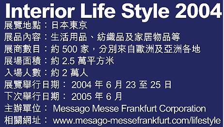 現代人生活緊張,回到家才能安靜下來,故對家居擺設的要求愈來愈高。剛在日本東京結束的InteriorLifeStyle2004,共有26個國家及地區、超過500家公司參展,帶來了各式各樣新穎的家具、廚具及家居物品,令每名參觀者看得不亦樂乎,我們將一連三天詳盡介紹這個精品雲集的展會。