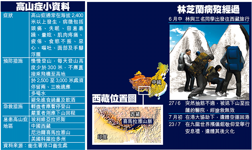 【本報訊】香港大學一名熱愛行山的二年級女生,六月中與同學聯袂到西藏旅行,但在旅程第十二日的晚上,女生突感不適,經六個小時搶救無效,客死異鄉;她的腦部出現水腫,是嚴重高山症的病徵。由於她向來沒有跟別人提及有嚴重疾病,故她的老師及同學對此均感突然。事件令人關注西藏高山地帶旅行存在的風險。 記者:倪清江 陸羽平 蔡元貴
