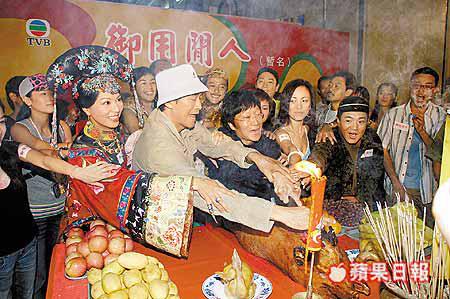 鄭少秋、楊怡、滕麗名及魏駿傑等,昨日在將軍澳電視廣播城出席無綫劇集《御用閒人》開鏡拜神儀式。