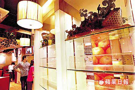 茶餐廳一角,闢作麵包廊,全透明的麵包箱、大大幅水果圖案的柱位裝飾,視覺上,與整體餐廳布局連繫起來,與偏向深沉的主廳色調形成對比。