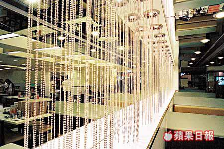 牆身維持一列長鏡示人,未免過於單調,設計師加進一串串鋼珠,懸掛於射燈位,由於旁邊的鏡面假天花處,正是冷氣風口所在,鋼珠在風力吹送下,會輕微擺動,營造動感。