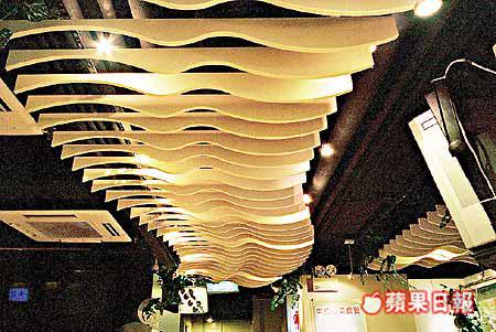 假天花的波浪型線條美,吸納一眾食客的視線焦點,在不同角落抬頭觀賞,就有不同的視覺效果,同時也有營造熱鬧氣氛的額外功能。